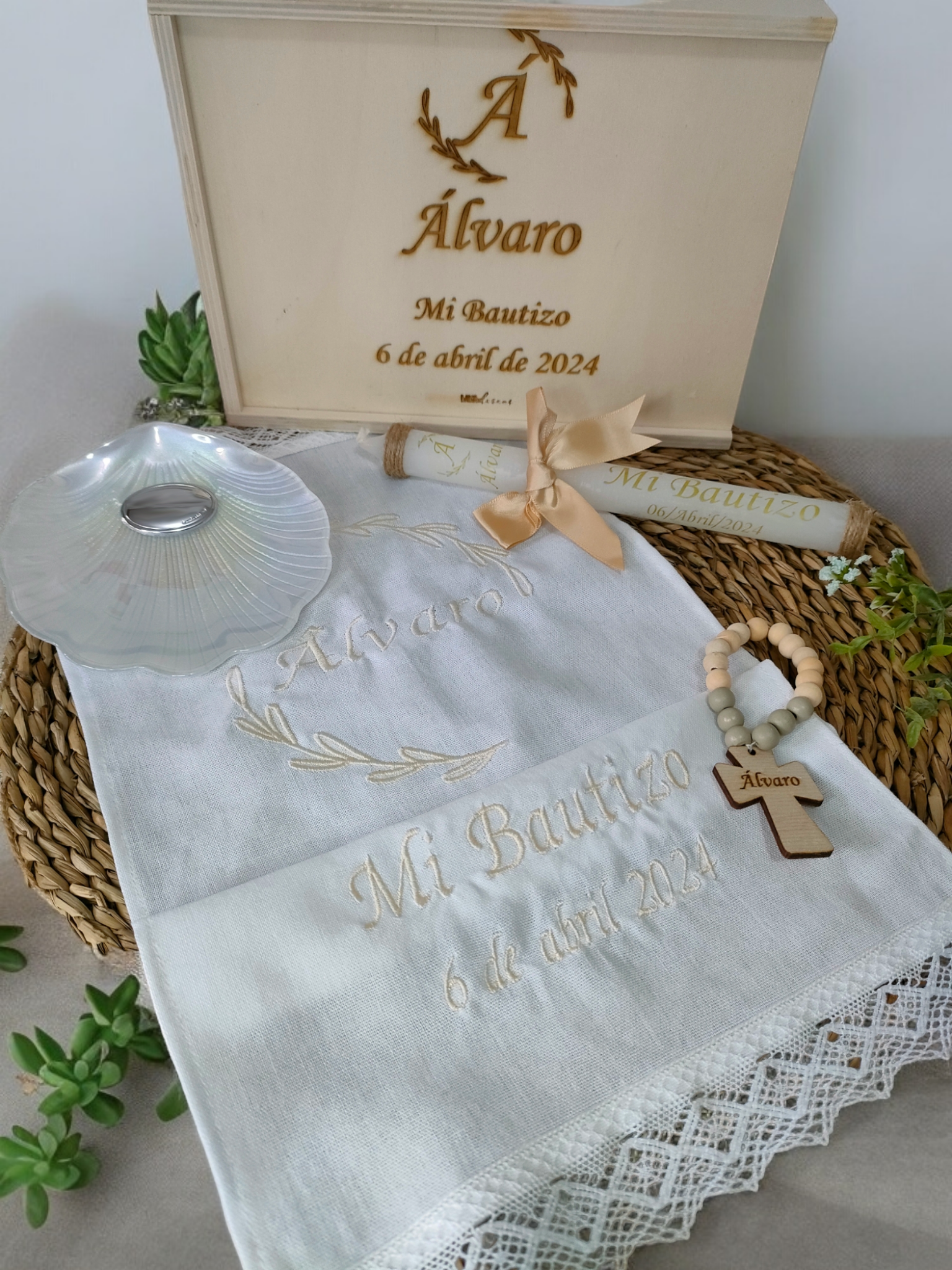 ✔️ Pañuelo bordado con el nombre del bebé y la fecha del bautizo.