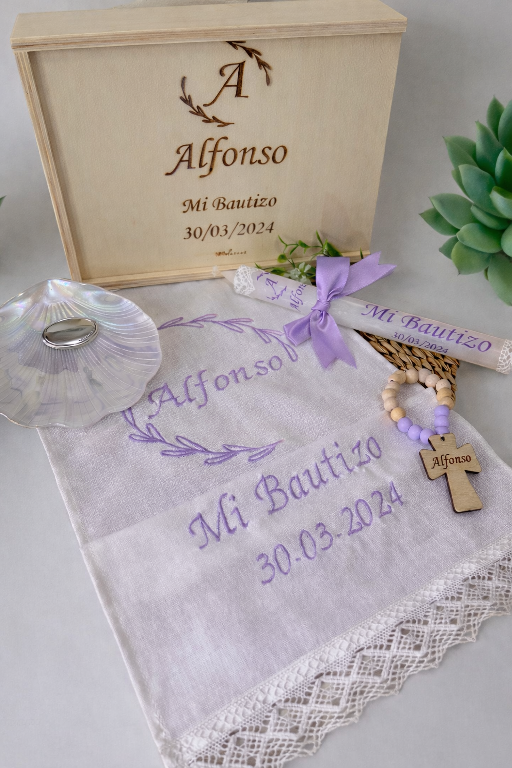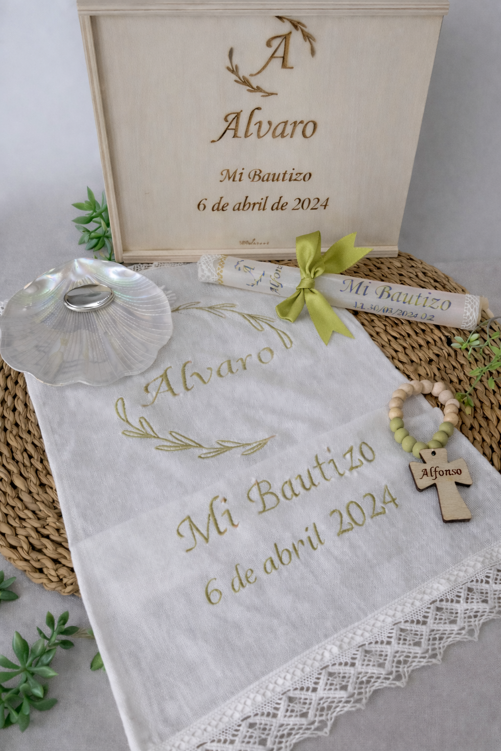 ✔️ Pequeño rosario con el nombre del bebé, un símbolo de bendición.