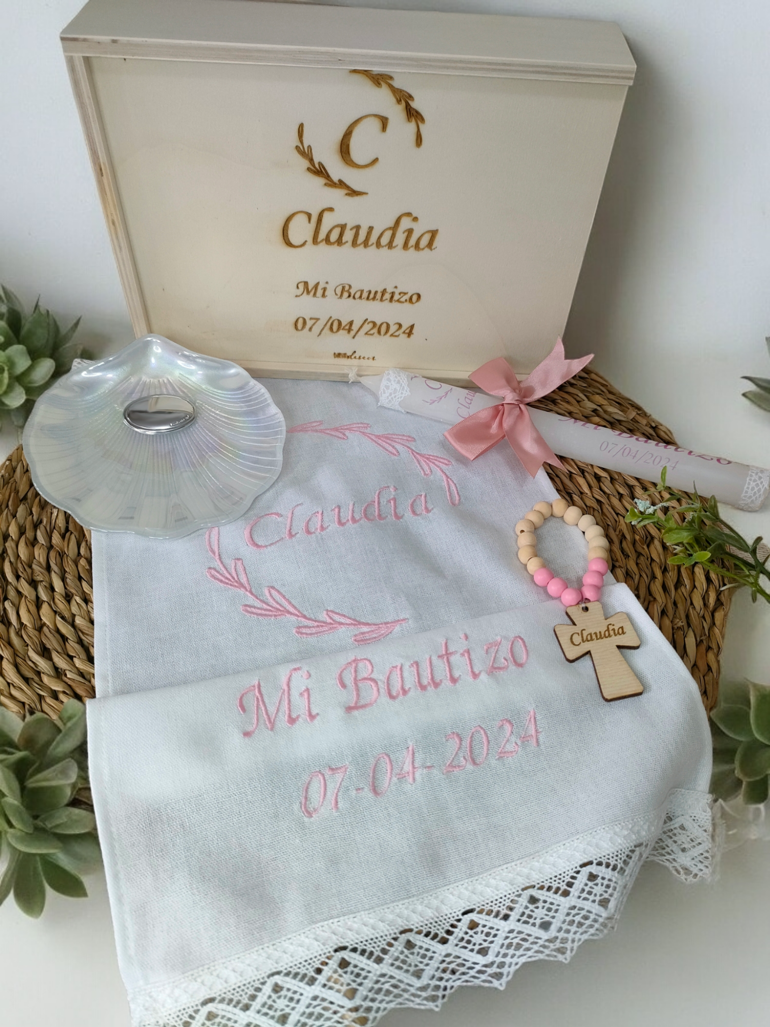 Celebra un momento único con nuestro Pack Kit de Bautizo Personalizado, el regalo de bautizo perfecto para tener un hermoso recuerdo con el que simbolizar la fe y el amor en este día especial. Disponible en cuatro colores diferentes, este set incluye todo lo necesario para la ceremonia, cuidadosamente diseñado con detalles personalizados para hacer del bautizo un evento inolvidable.
